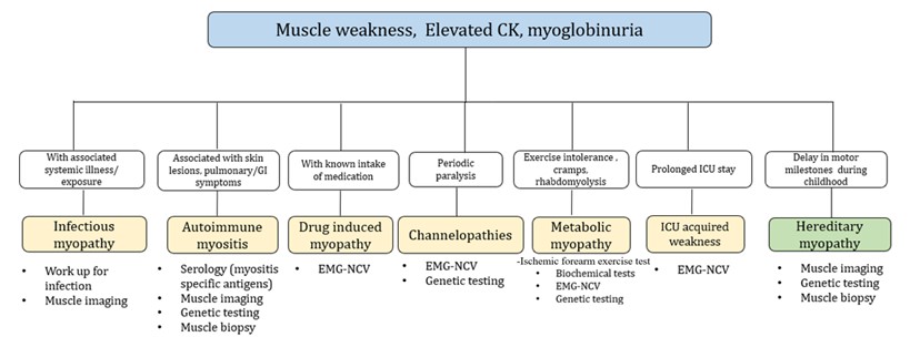 Neuromuscular disorders (NMD), characterized by muscle weakness, are classified within the lower motor neuron syndrome (LMN) [1]. These disorders can be categorized based on the specific level affected, including the motor neuron (neuronopathies), nerve root/plexus (radiculoplexus neuropathies), individual peripheral nerves (focal/multi-focal/diffuse polyneuropathies), neuromuscular junction (NMJ disorders), and muscle (myopathies). Myopathies encompass a broad spectrum of disorders that primarily affect the skeletal muscles, leading to weakness, fatigue and pain. These conditions can be either acquired or inherited, with varying etiologies and clinical presentations. Myopathies can arise from diverse factors, including infectious agents, autoimmune processes, metabolic abnormalities, genetic mutations and other underlying systemic diseases. Understanding the underlying mechanisms and classifying myopathies based on their etiology is crucial for accurate diagnosis and appropriate management.