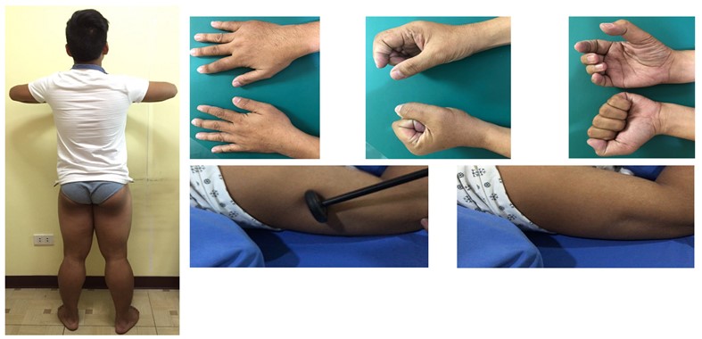 Scapular winging from atrophy can be elicited by asking patient to outstretch both upper limbs and to rest both palms on the wall. Neck muscle weakness, especially in flexion, can be a useful test, along with manual muscle examination focusing on specific proximal and distal joint movers. Facial weakness, characterized by drooping or lagging of facial expression and mimic movements, jaw bite and deviation, tongue at rest (for atrophy and fasciculations) and protrusion (for deviation). Specific eye movement impairment (ptosis/weak eye movements [EOM]), including eye closure observed in sleep) are helpful clues. Muscle hypertrophy which is best seen in gastrocnemius, hip, shoulder and elbow movers, for preferential muscle group/myotomal atrophy, and for abnormal movements like fasciculations (brief scattered twitches at irregular intervals; usually seen in chest, shoulder, upper back, proximal limbs and tongue), myokymia (muscle quivering, undulating and slower contraction of muscle strips), and rippling muscles (provoked by mechanical stimuli and stretch). Deep tendon reflexes (DTRs), assessed with a reflex hammer are important for evaluating reflex symmetry and ruling out upper motor neuron signs. In addition to grip myotonia, a reflex hammer is also used to elicit percussion myotonia by tapping the thenar eminence and finding delayed relaxation. Basic sensory examination will assist in eliminating neuropathic disorders.