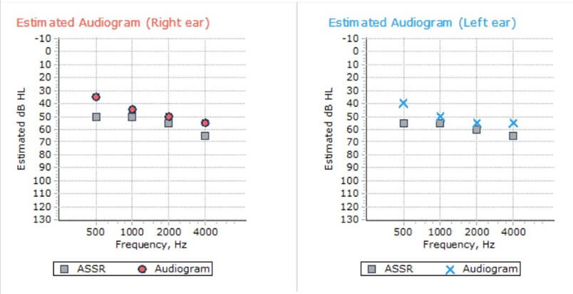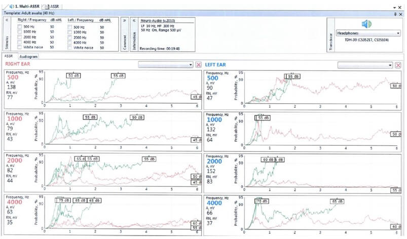 ASSRs were obtained using a neuro-audio.net system from Neurosoft Ltd, Ivanovo. The stimuli are pure tones (0.5, 1, 2, and 4 kHz), with a 100% amplitude and a 10% frequency modulation, the modulation frequency being around 46 Hz. After the stimulation has started, the algorithm seeks for a significant response in each of the frequency channels. As soon as the level of significance is reached in one channel, the algorithm stops recording in that particular channel (e.g., 45 dB at 2 kHz left), while recording continues in the other channels. In the channel in which significance is reached, the stimulation automatically restarts with a 5 dB lower intensity, and the process is repeated until no significant response is obtained after 6 minutes. The time progress of the eight channels is permanently displayed, and the system also displays an ‘audiogram’ (Figures 1 & 2).