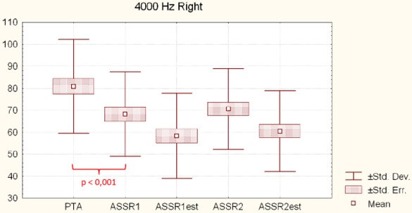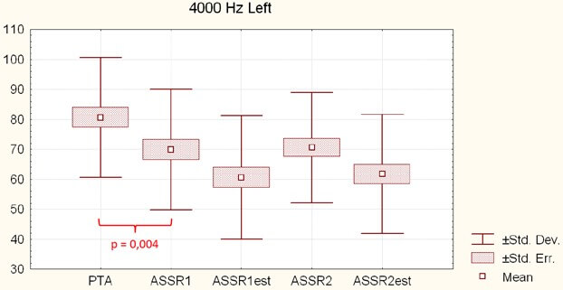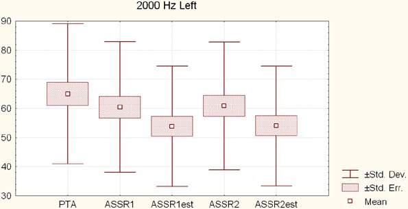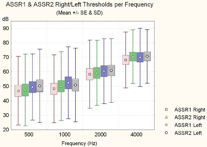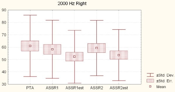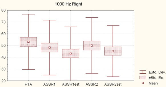 Figure 10 shows the mean ASSR (ASSR1 and ASSR2) thresholds, per frequency (0.5, 1, 2 and 4 kHz) for the right and the left ears (with mean, standard error and standard deviation), indicating the general shape of the audiometric curve: a flat curve for 0.5 kHz and 1 kHz, a rising threshold from 1 kHz on, and a maximal loss on 4000 Hz, as expected in NIHL.