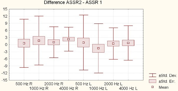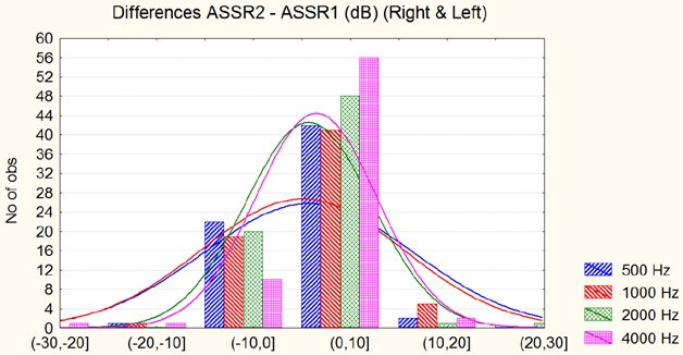 The histogram of the differences between the ASSR1 and ASSR2 thresholds, as displayed in (Figure 12), confirms that the vast majority of differences is less than 10 dB. There is a non-significant tendency in the sense of a slight worsening of the ASSR2 thresholds with respect to ASSR1 .