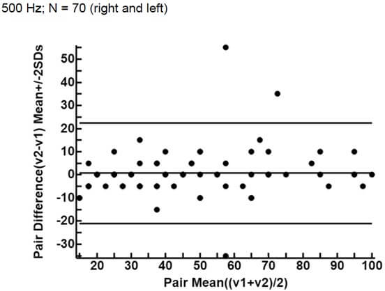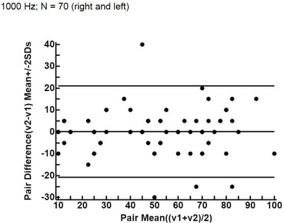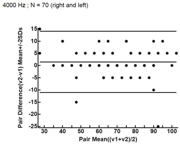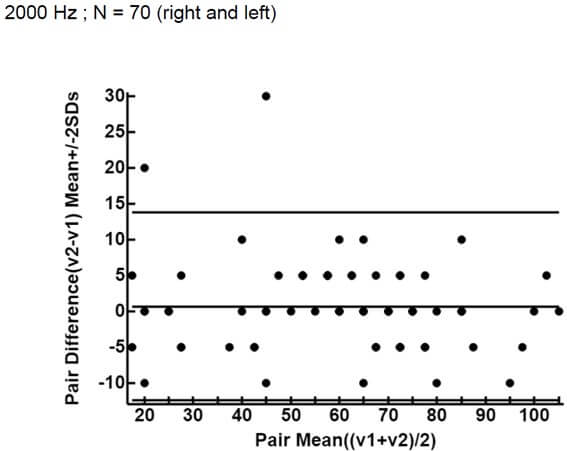 The ICC, that assesses the reliability of measurement tools by comparing the variability of different measures on the same subject with the total variation across all measures and all subjects [13], is 0.90 (CI: 0.84 - 0.94) for 0.5 kHz, 0.91 (CI: 0.84 - 0.94) for 1 kHz, 0.96 (CI: 0.93 - 0.97) and 0.94 (CI: 0.91 -0.96) for 4 kHz, which means an almost perfect agreement [14].