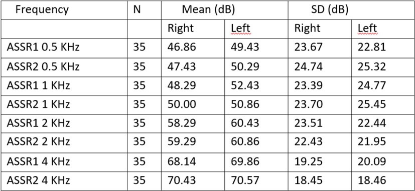 In a few cases, no ASSR-threshold could be obtained. In such cases, thresholds were set at the highest value that could be measured by the device: i.e. 95 dB for 0.5 kHz and 105 dB for 1, 2 and 4 kHz.
