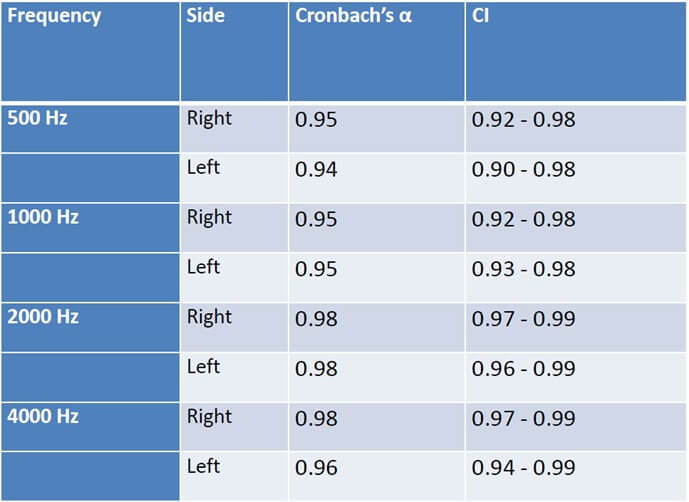 Table 2 displays the Cronbach’s α values (reliability coefficient) per side and frequency: all coefficients are in the range 0.94 - 0.98.